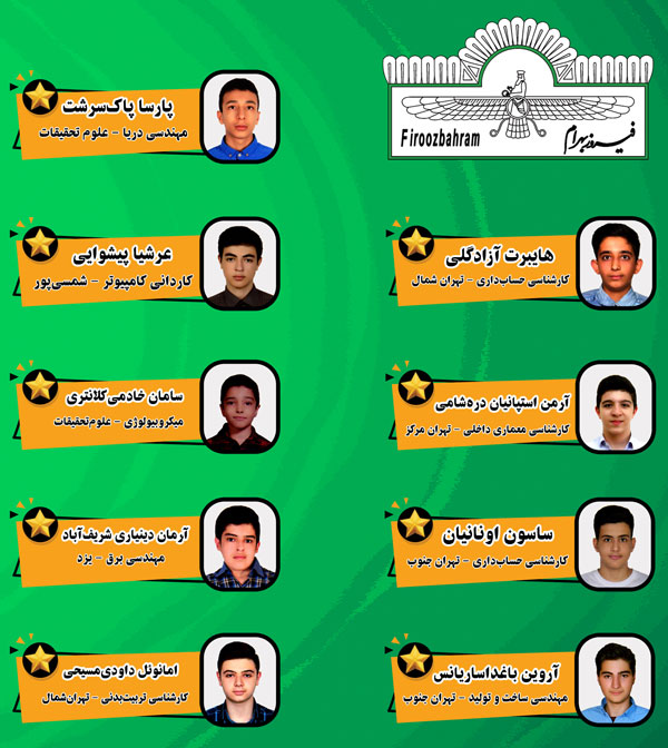 در آخرین سال تحصیلی قرن 14 خورشیدی یعنی سال تحصیلی 1399-1400 تعدادی از دانشآموزان فیروزبهرام به دانشگاهها راه یافتند. دانشآموزان راهیافته از چهار رشتۀ ریاضی، تجربی، کامپیوتر و حسابداری فیروزبهرام در کنکور 1400 شرکت کردند. این دانشآموزان از این پس بهعنوان دانشجوی رشتههای گوناگون در دانشگاههای سراسر کشور ادامۀ تحصیل خواهند داد. برای آنها و اولیای ارجمندشان تندرستی، شادی و دیرزیوی خواهانیم.